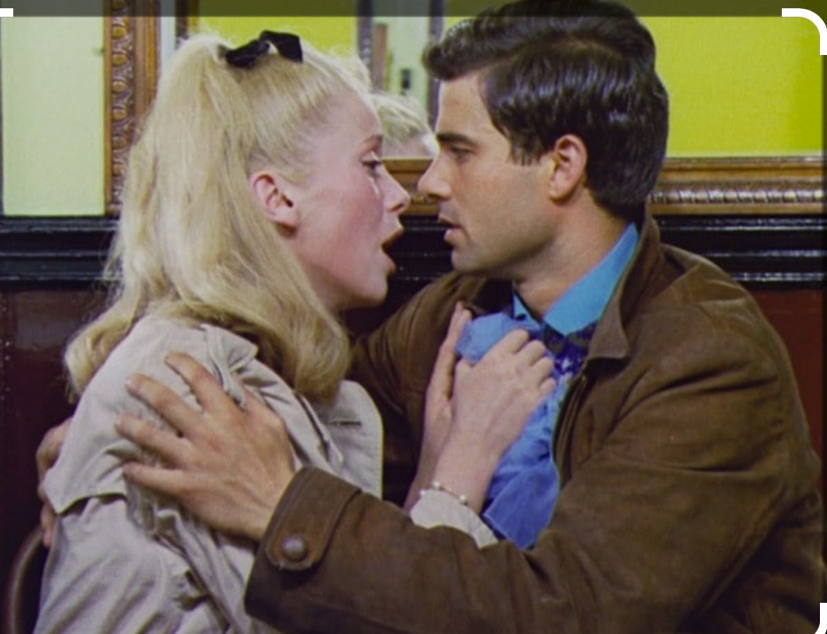 The plot? Genevieve (an ethereal, fairly unknown 21-year-old beauty named Catherine Deneuve) works in an umbrella store in Cherbourg, France circa 1957 owned by her mother, Madame Emery (Anne Vernon). Genevieve is in love with Guy (Nino Castelnuovo), a handsome young garage mechanic. He lives with his ailing aunt Elise (Mireille Perrey) who is cared for by a young nurse, Madeleine (Ellen Farner).