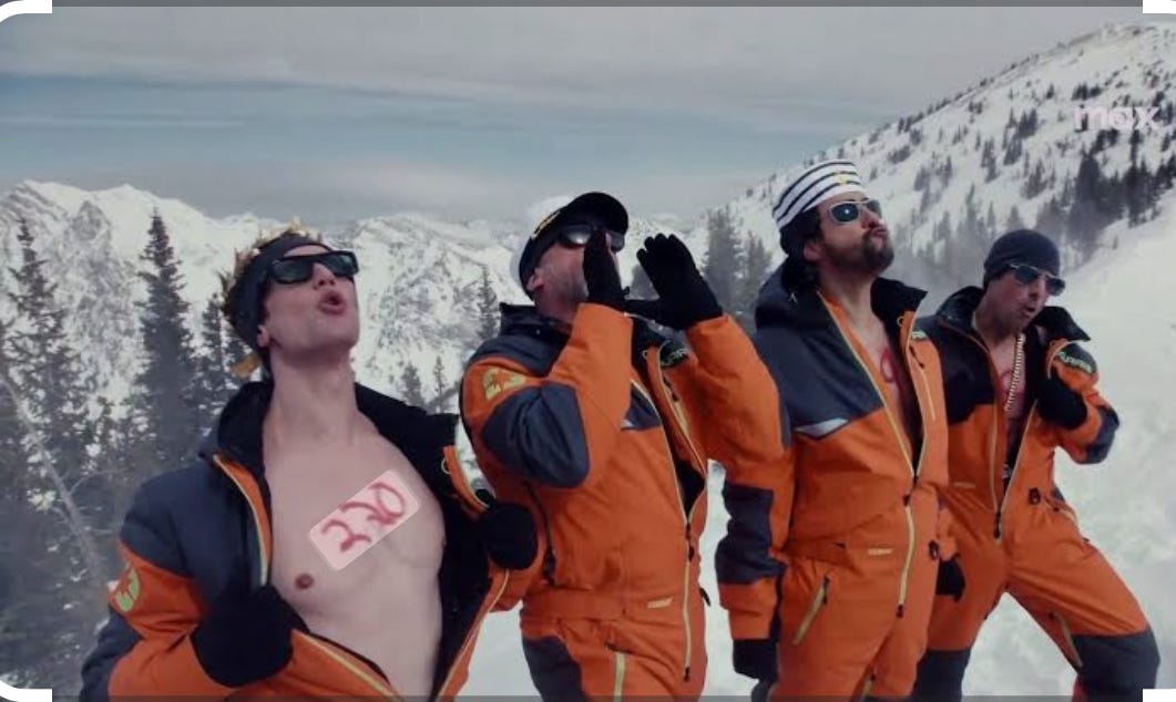 The movie follows these tech bros as they hike through snowy Deer Valley in orange jumpsuits, nibble on crudités and sip champagne. But it soon becomes clear that one of the four men is not in synch with the goal of ruling the world—and not just the tech world, either.