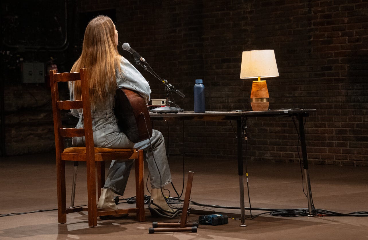 This 55-minute, one-woman show consists of Pirnot similarly sitting with her back to the audience, playing her guitar and warbling tunes you might have heard in a New Brunswick coffeehouse circa 1973. In between the songs (the musical director is Will Butler, a former member of Arcade Fire—go figure), she relates a very cryptic story about a bad turn in her sister’s life and its impact on the rest of the family. She spends time in various grief-therapy groups which, if you’re not a member of the family, is somewhat less than fascinating.