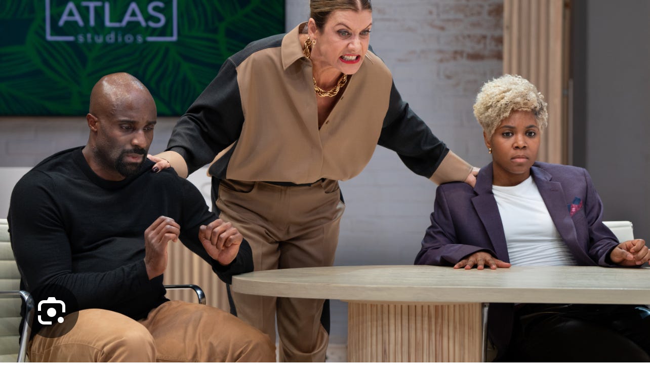 Act 1 is punchy and funny. The setting is a “full service rental studio and production facility,”specializing in fashion shoots and videos. The studio is run by Hailey (Kate Walsh), a domineering (“I have a steel vagina”) b*tch who feels her all-white Gen Z staff is making the firm less competitive in the marketplace. “We need more representation of people unlike us,” she proclaims.